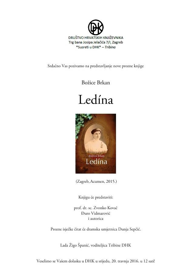 Poslije Zagreba, Sydneya, Križa, Čazme, Koprivnice, Dugoga Sela i Ivanić Grada moj roman Ledina predstavljen je u subotu 9. travnja 2016. i u Piljenicama, rodnome selu Đure Vidmarovića, književnika, književnog kritičara, povjesničara, političara i diplomata, prema čijoj je ideji ondje narastao i sad već četvrti održan književni Susret Rijeka, šuma, nebo. Promocija je bila finale ovogodišnjega susreta, a osim Dragutina Pasarića i maestra Vidmarovića, koji je ponovno našao nove riječi o romanu koji na zavičajnom jeziku o lokalnim temama, kako je rekao, stvara vrijedan, nacionalno relevantan tekst.