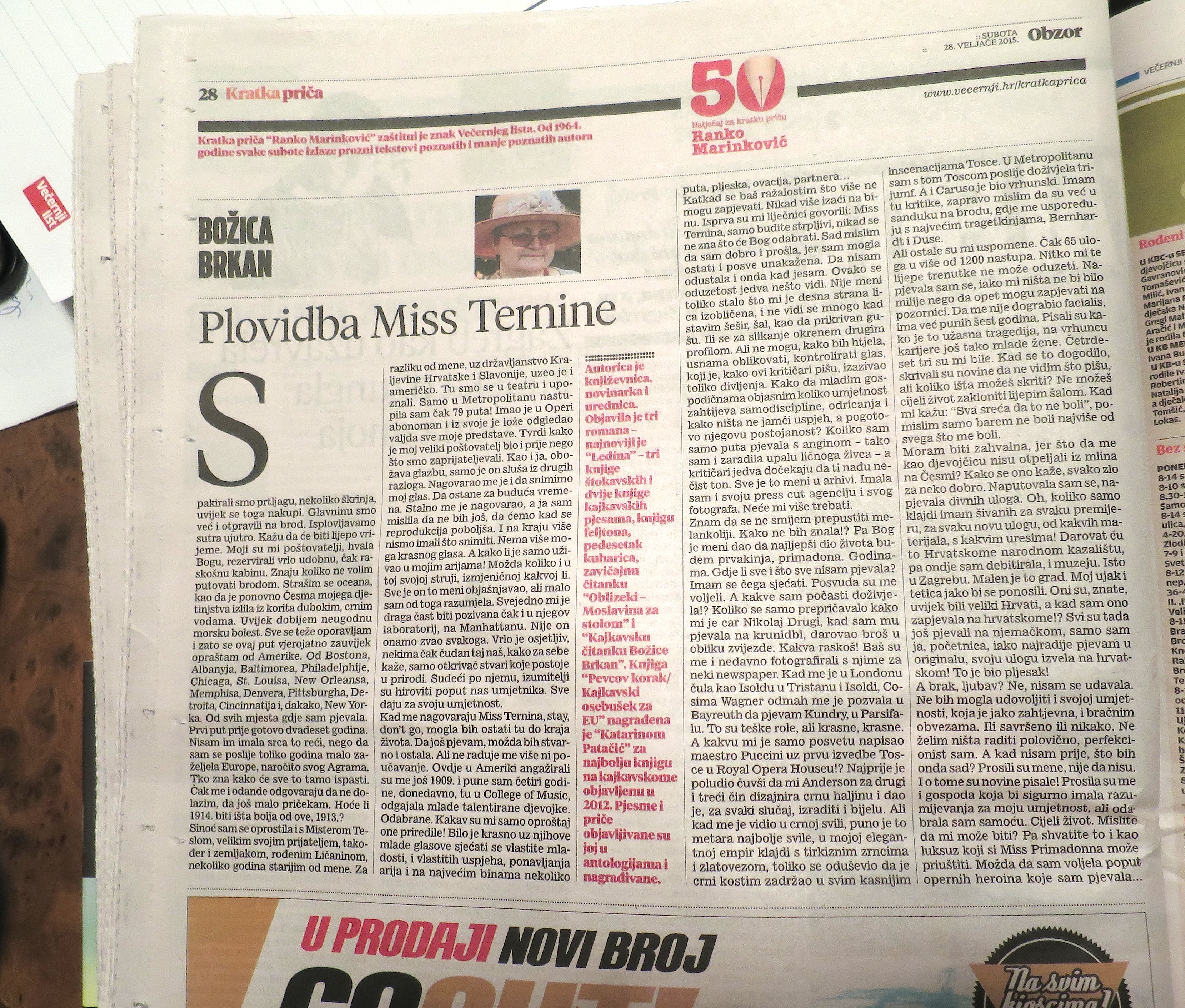 U Zborniku izabranih radova sudionika Matičinog književnog natječaja Ogranka Matice hrvatske u Velikoj Gorici “Turopoljska poculica” u razdoblju od 2009. do 2013. godine (urednik Stjepan Rendulić) objavljena je i kratka priča Božice Brkan iz 2011. godine “Sovica”.
