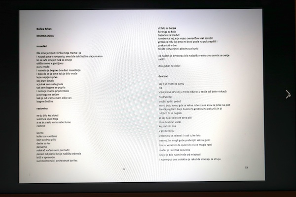 U prosinačkom broju koji kao glavni urednik potpisuje Dušan Gojkov, Balkanski književni glasnik broj 34. među 45 vrlo različitih autora od stranice 51. do stranice 62., uz biografiju s bibliografijom, naslovljeno Kronologija, objavljuje izbor 11 pjesama Božice Brkan: musolini, rastovina, dva bori, kajuce, pevcov korak, gda si ležem na zemlu, nadelena, doveka, ta moja kej pesma, postaja XV: molitva matere kristušove, breaking news.